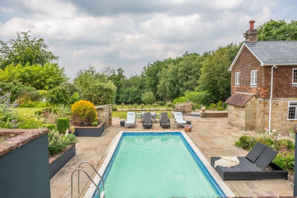 The grounds offer a tennis court, heated outdoor pool (April–September), hot tub, Finnish dry sauna, private steam cabin and a full outdoor kitchen with wood-fired pizza oven and teppanyaki grill. Inside, there is a snooker table, a private gym, and a stereo system. The kitchen is fully equipped and genuinely sized for cooking for ten people.