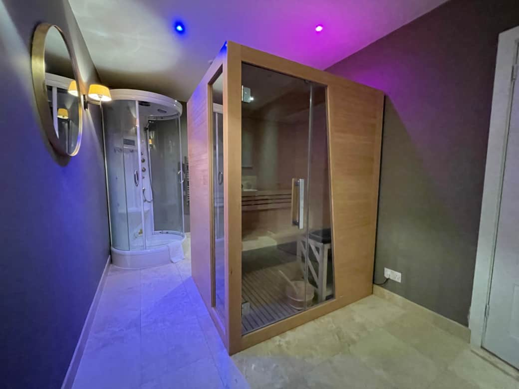 The private spa — Finnish sauna, steam cabin and outdoor hot tub — means there is always somewhere to escape the main group